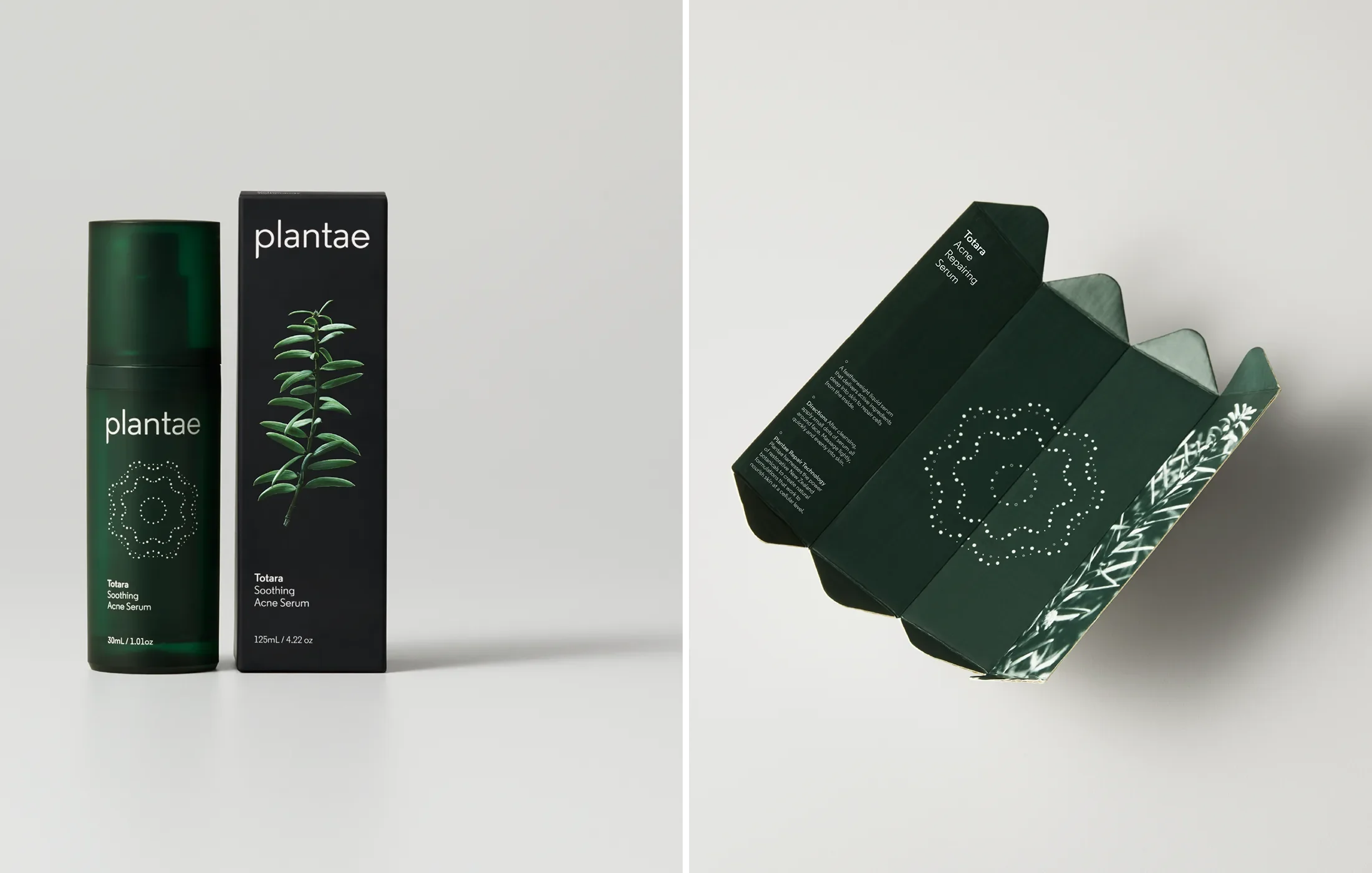 The result is a strategically-led identity evocative of the intersection of nature and science. The packaging isolates the main ingredient (Totara, in this case) as a scientific specimen, combining natural motifs with a tech-inspired, clean and clinical visual sensibility. A competitive analysis of the natural skincare category revealed an overwhelming bias towards white, cream and lighter-green colour palettes. This inspired the selection of the primary brand palette; moss green and scientific black, creating differentiation in the category at a glance.